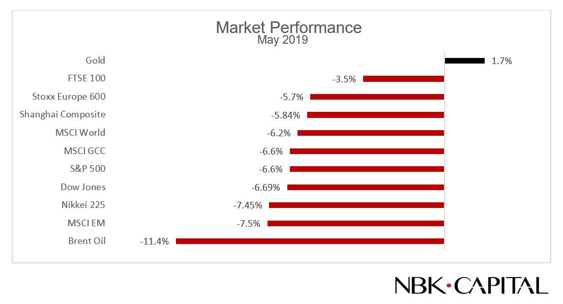 The market rally which started at the beginning of the year came crashing down in May after the US-China trade talks broke down and tariff rhetoric regained central stage. President Trump suddenly imposed new tariffs on Chinese imports, China retaliated, and trade tensions escalated sending investors into a risk-off mode and safe havens. Global equity markets went into a downward spiral fueled by concerns over global growth and bond markets rallied. Most equity markets recorded high single-digit losses during May sending their returns for the second quarter into negative territory. The MSCI AC World Index lost 6.23% during the month while losses for the MSCI Emerging markets Index were about 7.53%.
